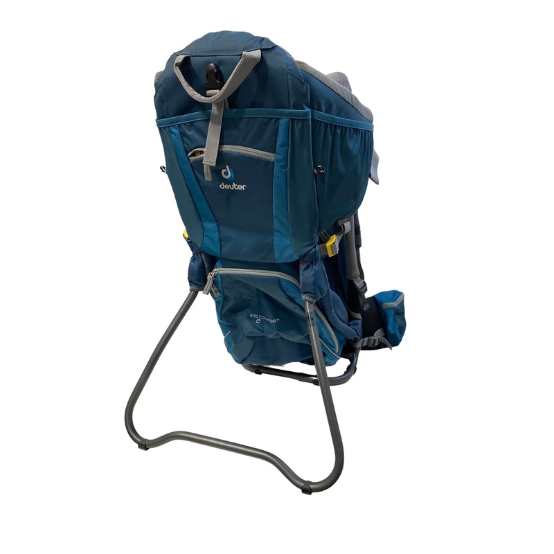 “High quality comfortable backpack ready for your next family adventure. Soft chin pad provides support for little ones to rest or nap. Features ample storage pockets, and a handy kickstand. Holds children up to 45 lbs.”