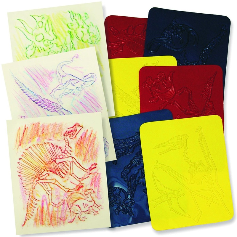Rubbing plates are versatile and fun for art, design, science, geography, and much more! Add texture to artwork by placing paper over a plate and rubbing with a crayon, marker or pencil to make the design. Layer designs for more effects. Make sun catchers using white glue and food color. Simply fill tray and let dry. Peel the resulting mold off and you’re done. Each set includes a guide. Dinosaur rubbing plate measures: 7″ x 7″. 6 design set.