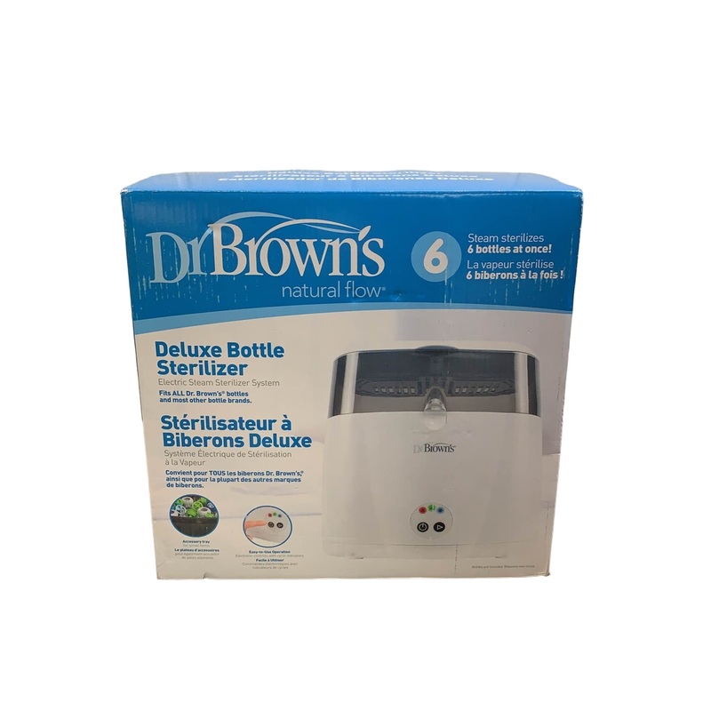 “This convenient bottle sterilizer uses steam to sterilize up to 6 bottles at once. Compatible with all Dr. Brown’s bottles and most other bottles as well. The built-in accessory tray holds bottle parts, nipples, pacifiers, and other small items, so you can sterilize everything at once.”