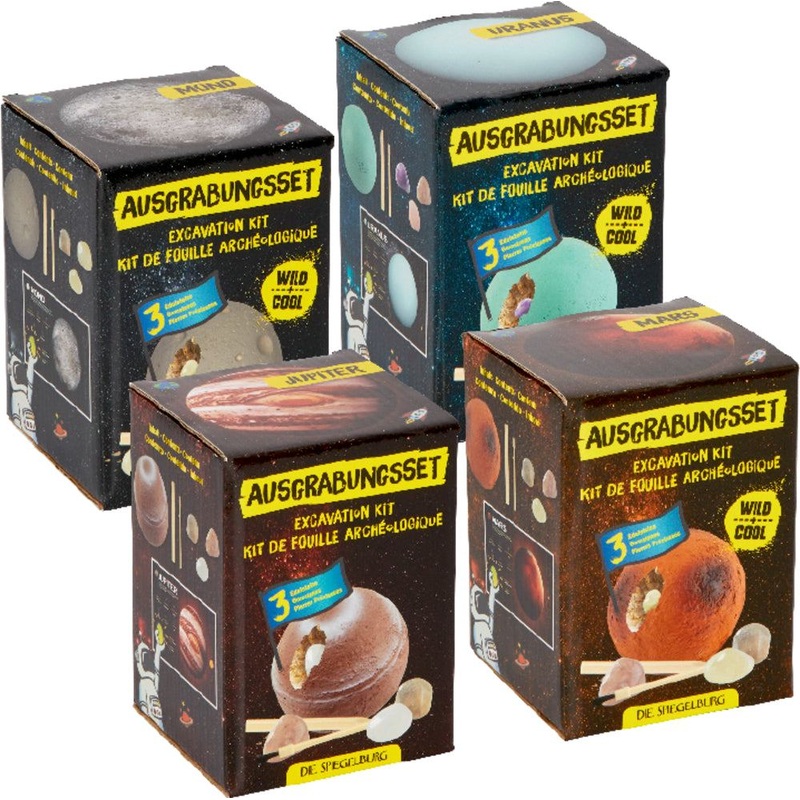 Dieses besondere Edelstein-Ausgrabungsset von Die Spiegelburg ist das perfekte Geschenk fr kleine Entdecker und Hobby-Geologen. Das spannende Set enthlt einen Ausgrabungsblock in Planetenform, aus dem mit dem enthaltenen Werkzeug aus Kunststoff drei echte Edelsteine freigelegt werden knnen. Neben den Edelsteinen bietet das doppelseitige Poster (ca. 45 x 27 cm) faszinierende Astro-Fakten. Das Set frdert nicht nur Neugierde und Feinmotorik, sondern liefert auch spannende Informationen. Verpackt in einer praktischen Box (10 x 14 x 10 cm), ist dieses Ausgrabungsset ideal fr spannende Entdeckungsreisen zu Hause. Das Wild + Cool Ausgrabungsset Planet ist in 4 Designs erhltlich. Eine Auswahl ist NICHT mglich und erfolgt zufllig.Altersempfehlung: ab 6 JahrenMae/ Gewicht/ Inhalt: Planet: ca. 8 cm, Poster: ca. 45 x 27 cm / Verpackung: 10 x 14 x 10 cmVerarbeitung: Ausgrabungsblock aus Kreide, Werkzeug aus KunststoffWarnhinweis: Achtung! Nicht fr Kinder unter 36 Monaten geeignet. Erstickungsgefahr durch Kleinteile.
