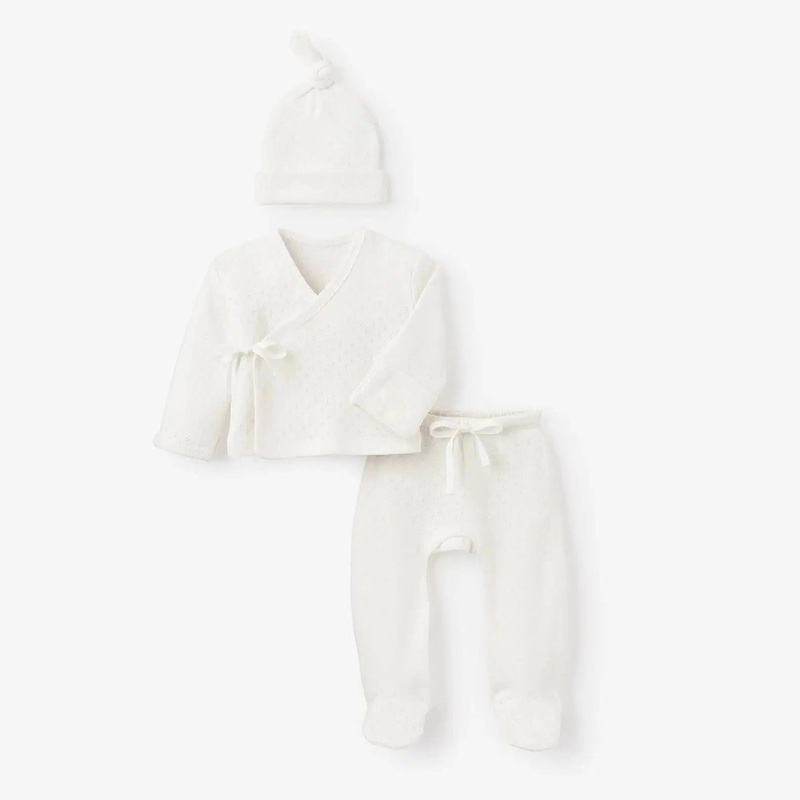- 3 piece set includes: adjustable hat, kimono top, and footed pants