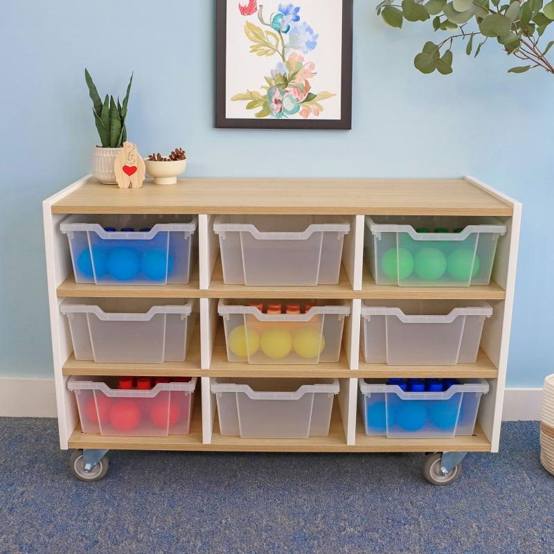 Compact mobile classroom storage in a crisp contemporary design! Refined contrasting white and textured white oak panels form crisp, clean lines for a sophisticated modern look. Nine spacious cubby storage compartments hold nine clear Gratnell trays that m