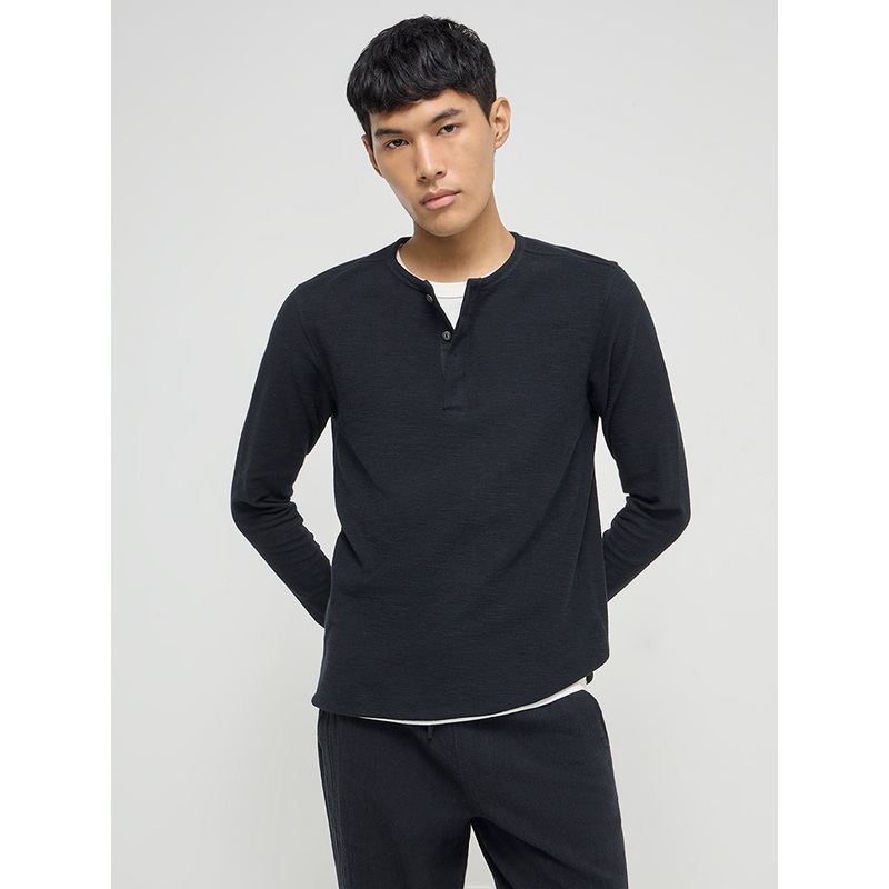 ETA launches this black t-shirt a slim cut. Crafted with pure cotton, the garment features a henley neck and full sleeves for a smart look.