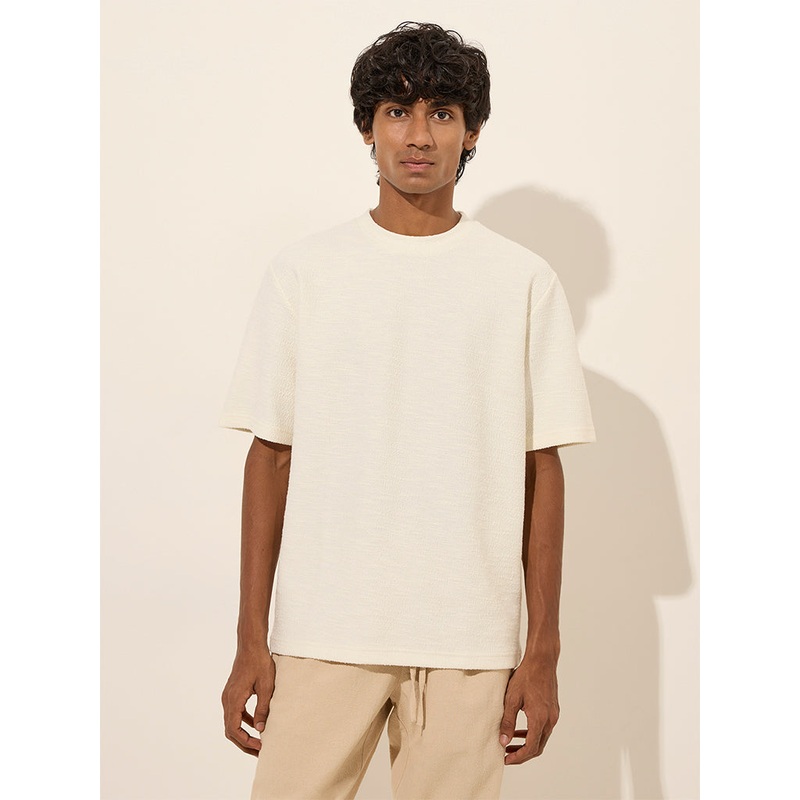 Crafted from soft, breathable fabric, this off-white T-shirt from ETA features a subtle textured finish. With a classic crew neck and half sleeves, its an easy choice for effortless everyday styling.