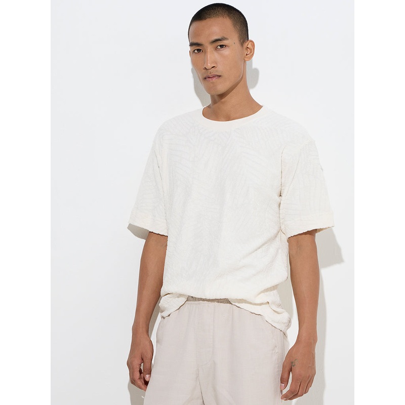 ETA unveils this white t-shirt boasting a self-textured profile. Made from pure-cotton, the relaxed-fit separate is structured with a round neck and half sleeves.