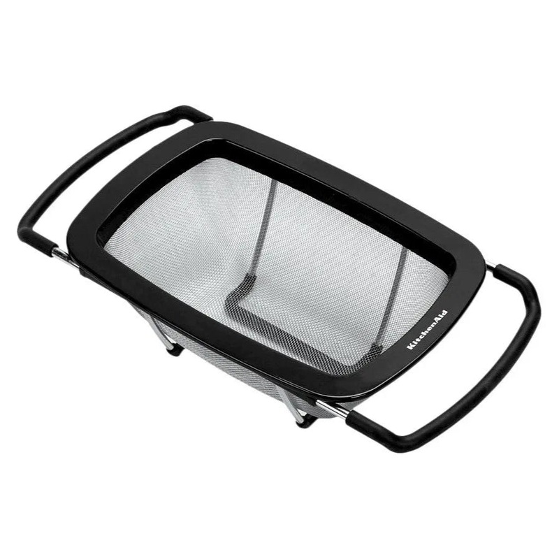 This KitchenAid Expandable Colander/Strainer strains fruits, vegetables, cooked pasta and more. Crafted from stainless steel, this strainer has a plastic trim with non-slip rubber encased handles that expand to securely fit across almost any size sink. This colander features rubber encased feet let the strainer sit inside your sink or on your counter without slipping or scratching. The handles of this strainer pull out to fit securely across your sink. This strainer/colander will fit most sinks; the basket measures 12-inches, fully closed, the strainer measures 16-inches and fully expanded, it measure 22-inches. Dishwasher safe for easy and quick clean up.