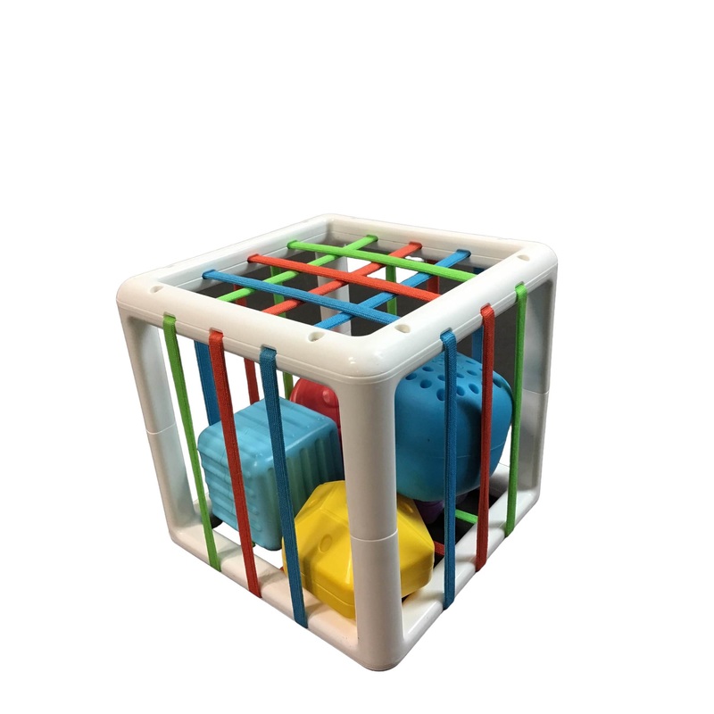“Your little ones mind will be delighted by the textures and shapes of the blocks so that they can experiment as they push them through the bands into the cube.”