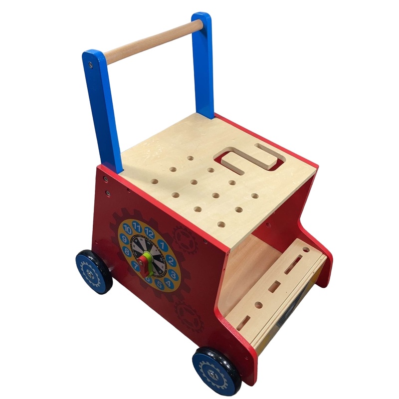 “Ready to walk, but not quite? This adorable wooden tool bus will aid in those first steps! It also doubles as a tool bench with multiple sides of age appropriate activities to keep your little one busy. “