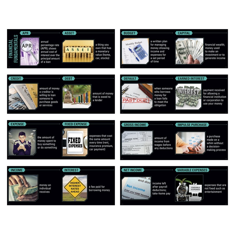 • Financial fundamentals academic vocabularyAPR, asset, budget, capital, credit, debt, default, earned interest, expense, fixed expense, gross income, impulse purchase, income, interest, net income, and variable expense