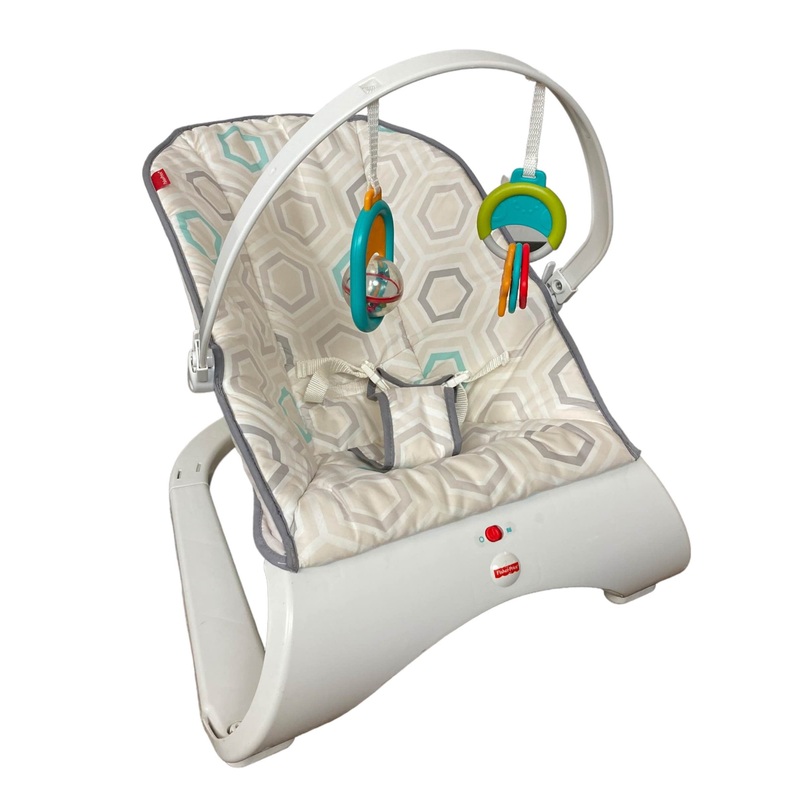 “This sleek and modern bouncer is sure to become your baby’s favorite place to rest or play. Natural kicks and movements activate the calming bouncing motion that babies love. The optional calming vibrations and soft cozy seat make baby feel safe and comforted. The removable toy bar features 2 stimulating toys to help entertain your little one when he’s ready to play. Seat pad is removable and machine washable.”