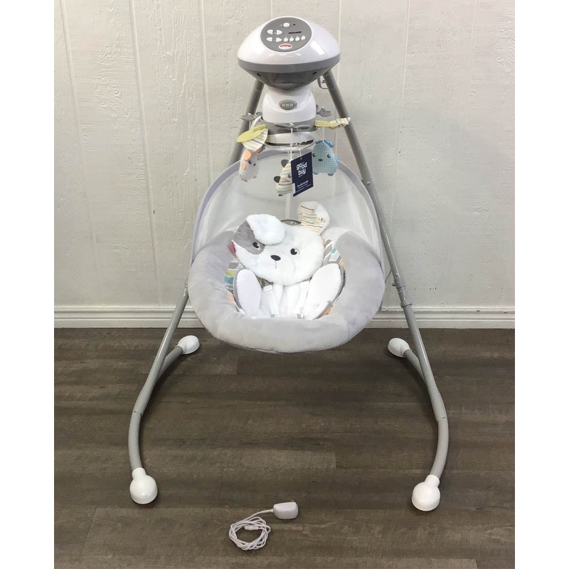 Condition: Gently Used "Sweet dreams darling baby, this gentle swing is sure to lull you to sleep. Between the soft puppy insert, calming music and relaxing sway, this swing wins on all fronts. A mobile with animals overhead entertains while music or natur