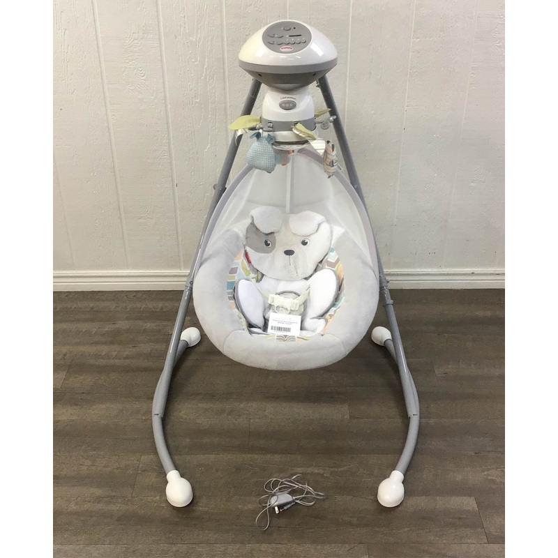 Condition: Gently Used"Sweet dreams darling baby, this gentle swing is sure to lull you to sleep. Between the soft puppy insert, calming music and relaxing sway, this swing wins on all fronts. A mobile with animals overhead entertains while music or nature