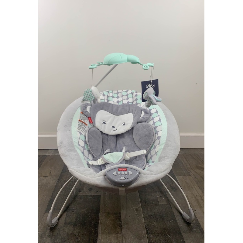 “Wind your baby down in this comfortable bouncer with calming vibrations and soothing music. The plush seat fabric is soft and gentle on baby’s skin, and the monkey design adds an adorable touch of whimsy.”