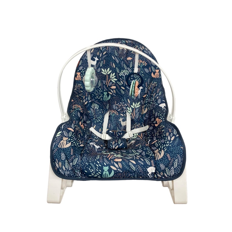 “Fun and convenient rocker. Toy bar removes to turn this into a toddler chair. Calming vibrations soothe younger babies. Fold out kickstand reclines and stabilizes seat for lounging or playtime.”