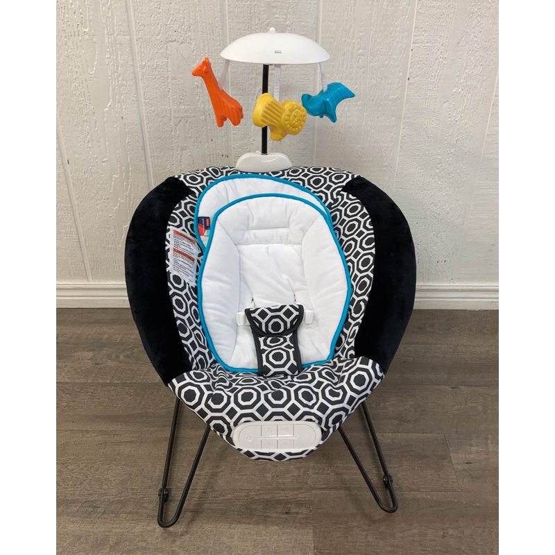 “There is so much to love about this fresh and modern baby bouncer! It features premium extra luscious fabrics that are a joy for baby to touch, calming vibrations to help baby relax, and the music and soothing sounds, as well as an overhead mobile will keep your little one happily entertained while you enjoy some much needed me time. “