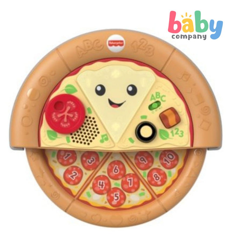 | the Laugh & Learn Slice of Learning Pizza toy, babies and toddlers can stay in, grab a slice, and learn all about counting, opposites and shapes through deliciously fun pretend play. This musical learning toy features a light-up cheesy face, sliding slices with numbered pepperoni, and two topping buttons for little hands to press and move to activate lights and music. Busy activities like spinning the tomato and sliding the pizza slices helps strengthen babys fine motor skills, while exciting songs and phrases introduce numbers and more. |