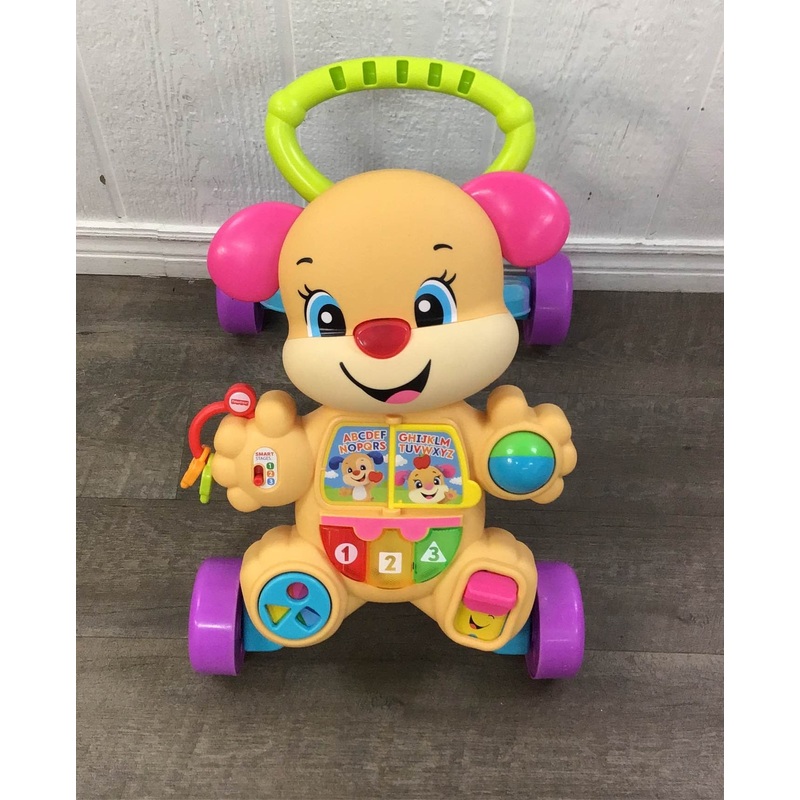 “Watch your little one push this happy puppy around the kitchen. Or, if they arent ready for that they can still sit on the floor and play with the buttons, lights and little book. The interactive toy helps with gross motor skills, numbers, the alphabet, colors and even words in Spanish. Theres over 75 ways to enjoy this solid toy. Recommended for ages 6 months and up.”