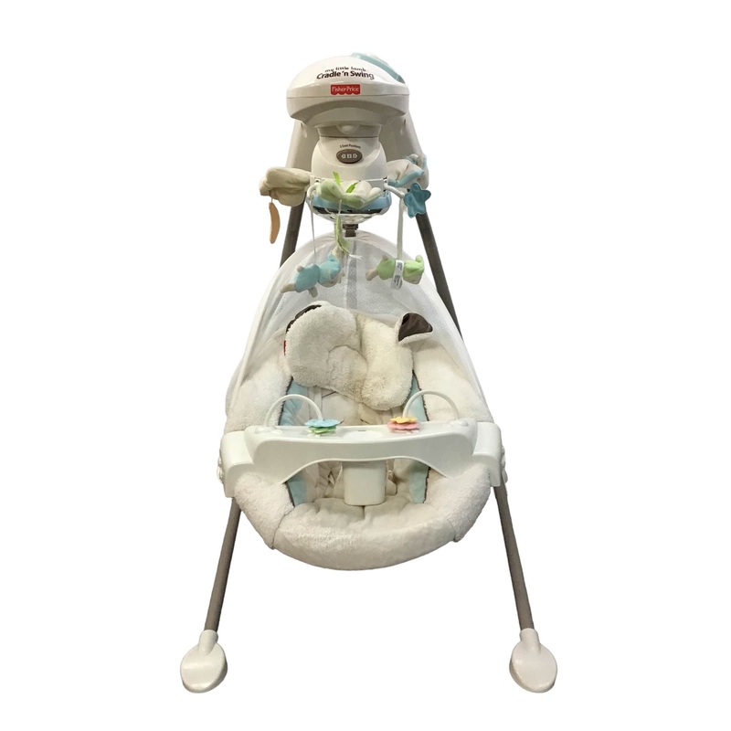Condition: Gently Used"Soothe your baby in this cozy swing that plays music and side-to-side and back-and-forth cradle motion with six speeds. Has a removable tray with toys. "