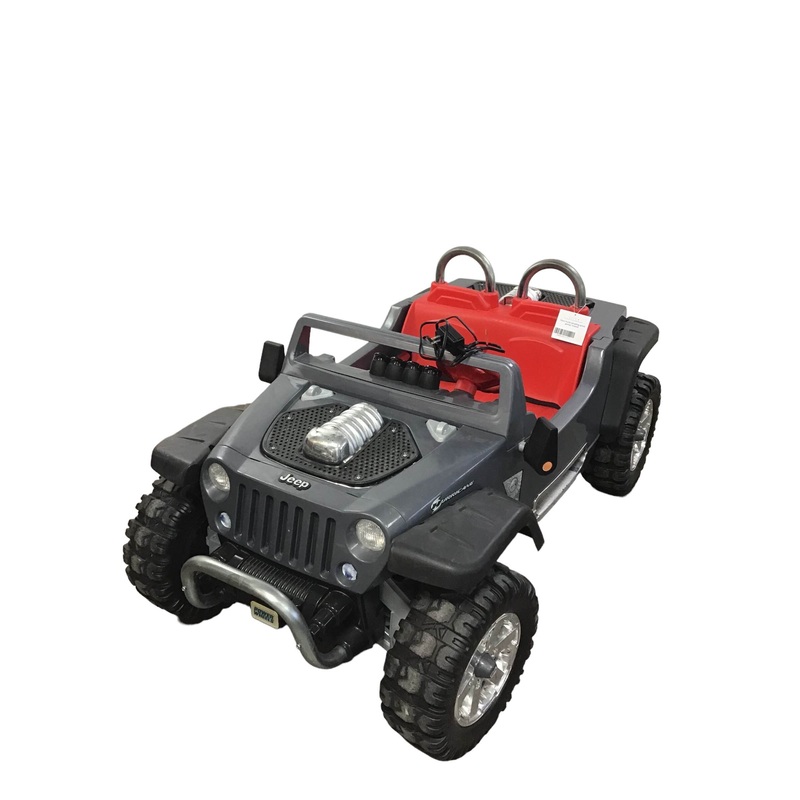 “Wow your kids with this ride on Jeep Hurricane- The perfect vehicle for backyard off-roading adventures! The 12 volt rechargeable battery and monster treaded tires are ready to handle any hard surface or grass. The real working radio, glove box, and ignition will make kids feel like they are driving the real thing. It features 2 forward speed settings (2.5 or 5 mph) and can also go in reverse. Fits 2 children with a 130lb combined weight capacity.”