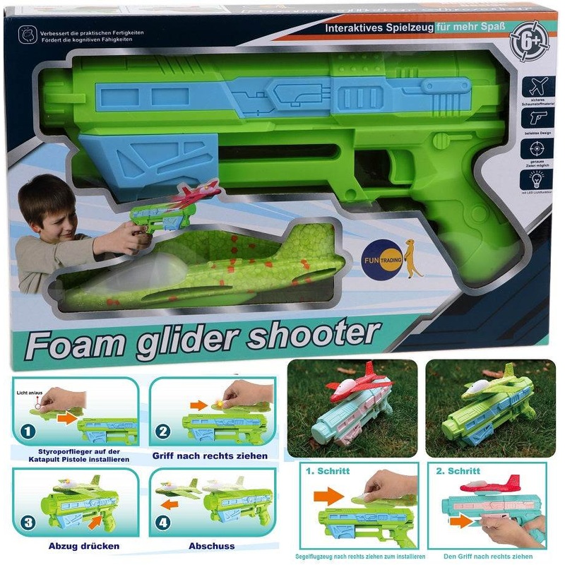 Dieser coole Styropor Flieger mit Licht zum Abschieen ber eine Katapult Pistole von Fun Trading, bringt Freude in kleine Abenteurerherzen und weckt die Bewegungsfreude bei Kindern und Erwachsenen. Er fliegt zielgenau viele Meter weit. Ersatzflieger fr die Pistole sind hier in unserem Shop erhltlich.ACHTUNG!!! Artikel ist in zwei unterschiedlichen Farbvarianten erhltlich. Eine Auswahl erfolgt zufllig!! Modell: 5123Alter: ab 3 JahrenFarbe: Blau/Grn ; Trkis/RosaInhalt: 1 Flugzeug mit Licht und PistoleFlugreichweite: 15 – 20 Meter