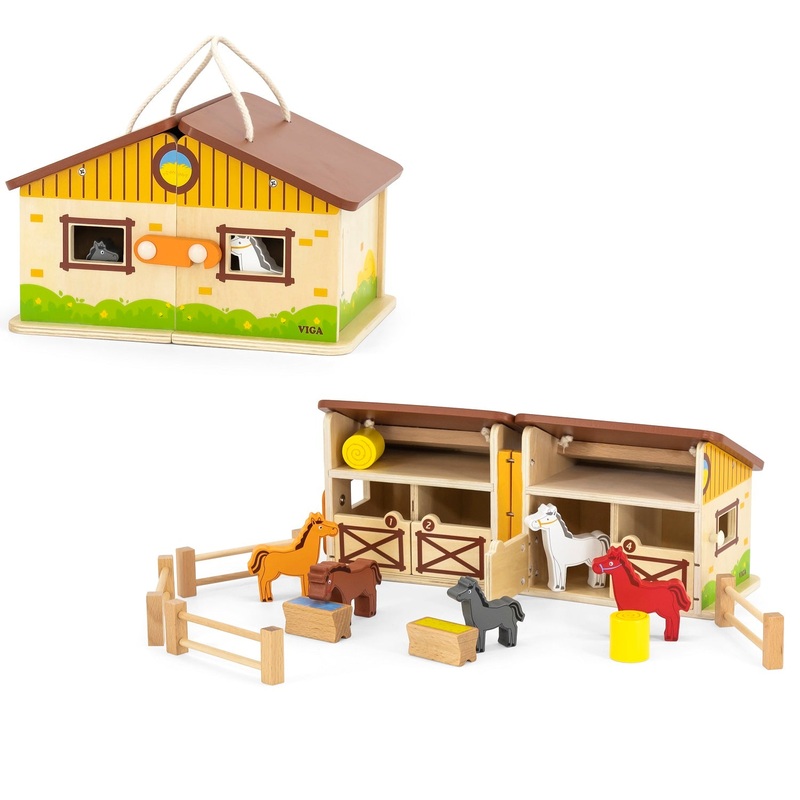 The horse stable features 4 swing open stable doors that are each numbered. The sturdy wooden stable box features a carry handle on the top making it easy to take along on trips.