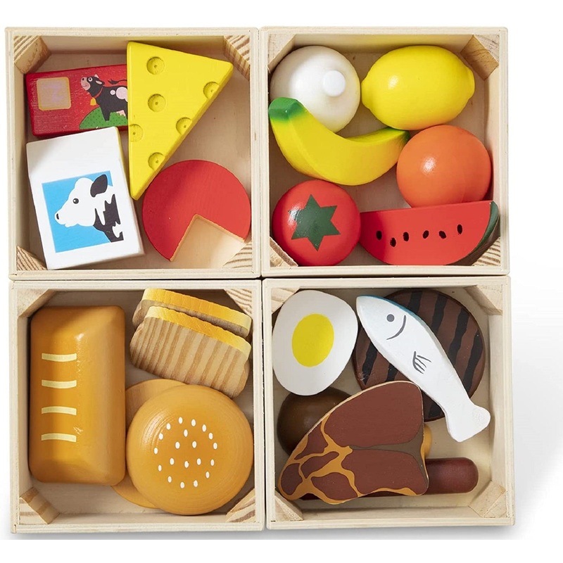 This 4 crate set of wooden toy play food contains lots of healthy food, including fruit, vegetables, meat, bread and dairy food, all of which can be arranged in the four wooden food crates.