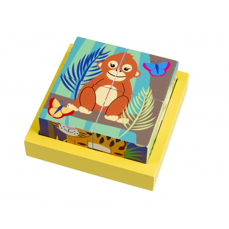 This bright and colourful Jungle animal four blocks puzzle in a wooden tray has four decorated jungle animal themed cubes which challenge children to form six different images. Puzzles include monkey, elephant, tiger, crocodile, zebra and chameleon. These puzzles are brilliant fun and wonderful developmental toys.