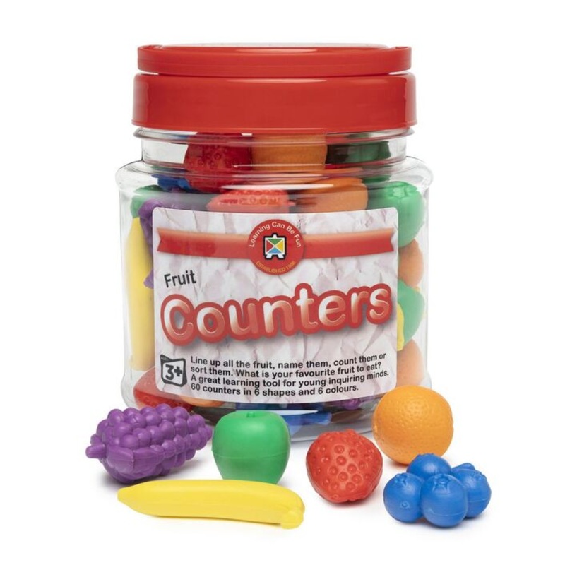 Count the fruit, name the fruit or sort the fruit. Keep little minds busyplaying shops or just having fun. Comes in a sturdy PET jar of 60 -6 shapes and 6 colours.