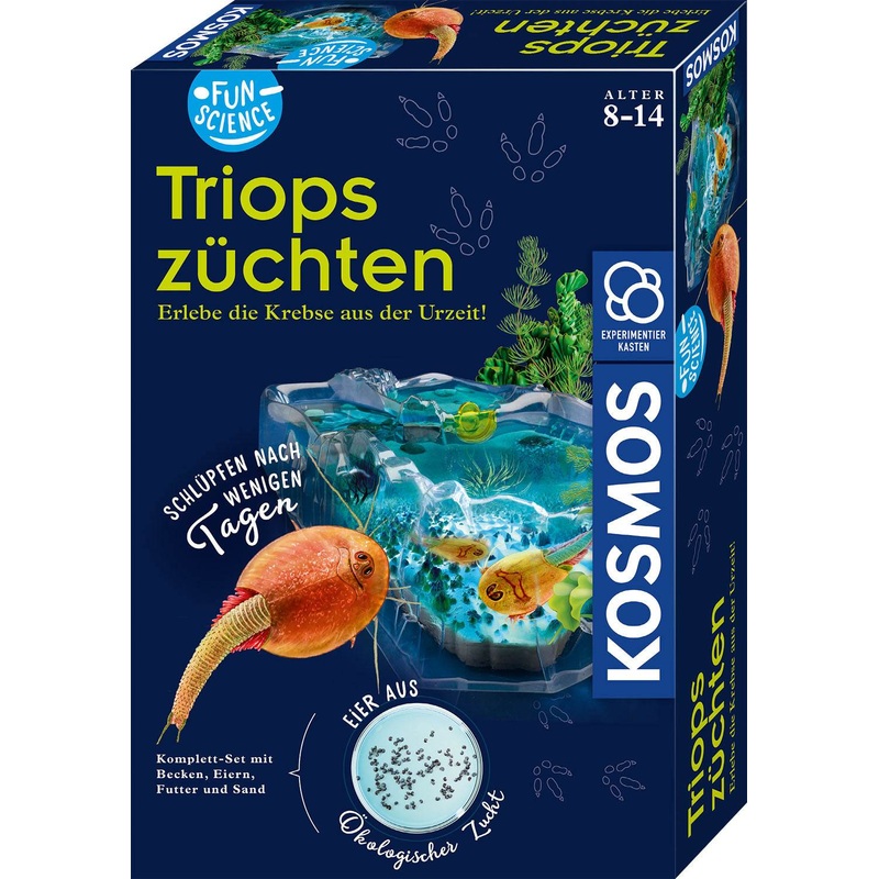 Mit diesem Starter Set knnen kleine Forscher echte Urzeitkrebse zchten! Der Kosmos Experimentierkasten liefert alles, was Kinder fr die Triops-Zucht und Pflege brauchen. Von der Vorbereitung des Aufzuchtbeckens ber das Fttern bis zum Heranzchten der nchsten Generationen die bebilderte Anleitung erklrt in einfachen Schritten, wie die Aufzucht gelingt. Die Triopse schlpfen bereits nach wenigen Tagen. Sind sie alt genug, drfen sie den abgetrennten Aufzuchtbereich verlassen und das Becken erkunden. Welches Futter werden sie wohl am liebsten mgen? Kinder zwischen 8 und 14 Jahren lernen, mit den Tieren verantwortungsvoll umzugehen und erfahren, mit welchem spannenden Trick die Urzeitkrebse aus der Zeit der Dinosaurier bis heute berlebt haben! Ein tolles Geschenk und Mitbringsel fr kleine Entdecker.Inhalt: Triops-Eier, Triops-Futter, Sand, Kalksteine, Becken mit Aufzuchtbereich, Abtrenn-Tor, Thermometer, Schlauch, Spritze, Holzspatel, AnleitungZustzlich wird bentigt: geeignetes stilles Mineralwasser oder destilliertes Wasser, Schreibtischlampe oder andere wrmende Lichtquelle, NatronModell: 637231Alter: ab 8 JahrenMae: 295x200x68mm (LxBxH)ACHTUNG! Fr Kinder unter 3 Jahren nicht geeignet. Erstickungsgefahr, da kleine Teile verschluckt oder eingeatmet werden knnen. Strangulationsgefahr, falls lange Schnre um den Hals gelegt werden.