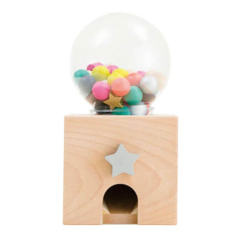 A cute wooden re-make of the traditional metal & plastic gumball machine.