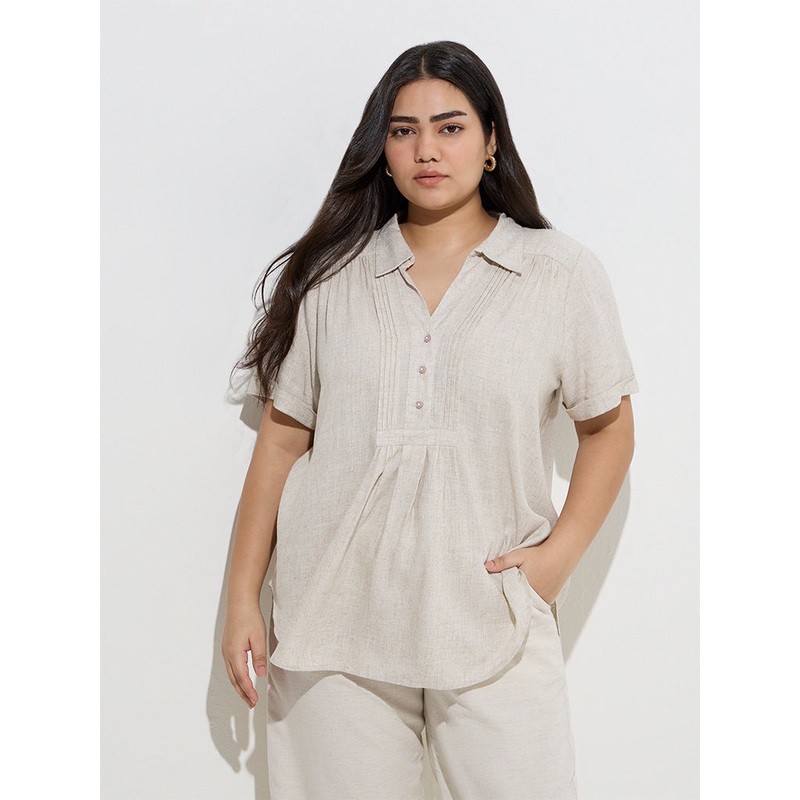 This beige blouse from Gia is crafted from lightweight fabric and elevated with pintuck detailing along the front. Designed with a spread collar that extends into a short button placket, it is finished with half sleeves, offering a polished yet easy option for everyday wear.