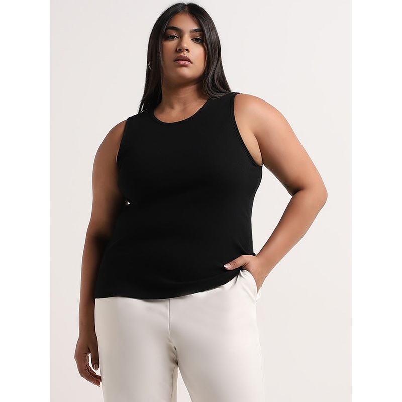 Black tank top by Gia featuring a ribbed frame with a crew neck and sleeveless design. Pair this with a jacket of your choice.
