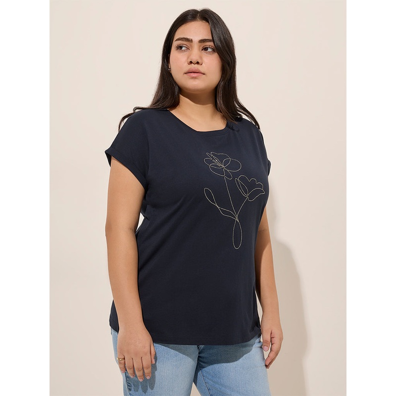 Gia Navy Floral Embroidered Cotton T-Shirt