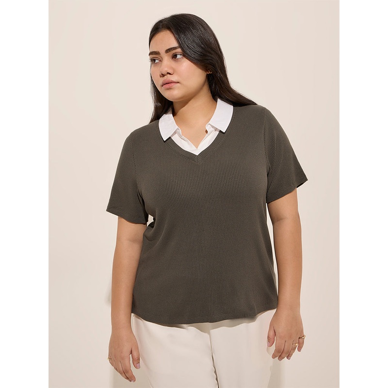 Add a refined touch to your casuals with this olive t-shirt from Gia. Featuring a ribbed texture, a sharp V-neckline, and an attached white collar for a layered effect, this half-sleeved piece effortlessly blends comfort with style.