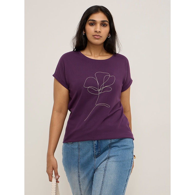 This purple t-shirt by Gia showcases an embellished floral design. Made from pure-cotton, it includes a crewneck and upturned dolman sleeves.