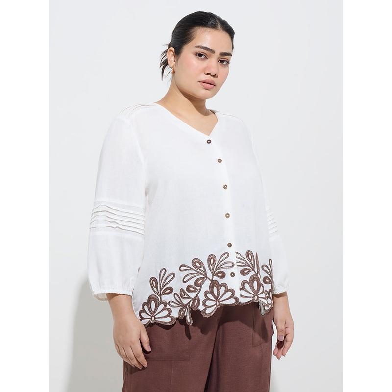 Gia presents this white blouse, elegantly adorned with floral embroidery. Crafted from a breathable linen-blend fabric, it features a flattering V-neckline that flows into a button-up front. The peasant sleeves, accented with delicate pintuck detailing, ad