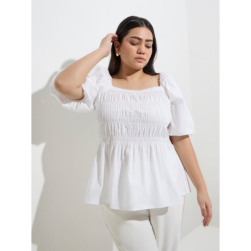 Add a touch of graceful charm to your wardrobe with this white top from Gia. Crafted from a breathable fabric, it features a flattering square neckline, a smocked bodice for a structured fit, and elegant blouson sleeves for a timeless appeal.