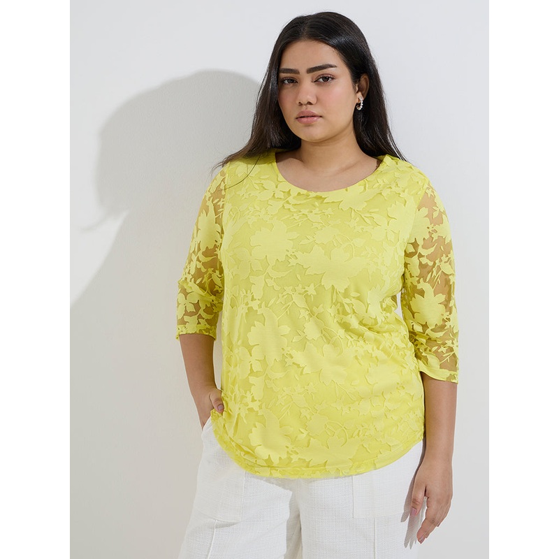 This yellow top from Gia showcases a floral lace design. Milled from a lightweight fabric, it is complete with a round neck and three-quarter sleeves.