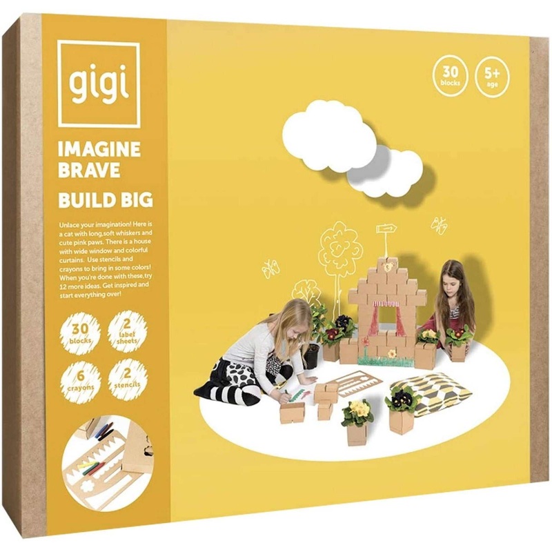 Gigi ist eine besondere Bausteinmarke, die ganz auf Nachhaltigkeit setzt. Mit diesen, vielfach preisgekrnten Bausteinen knnen Kinder echte, lebensgroe Schlsser, Festungen, Raumschiffe, Huser, Hhlen, Trme und vieles mehr bauen.Fantasievolles, freies Spielen ist wichtig fr die kindliche Entwicklung, mit diesen Bausteinen knnen Kinder immer die passende Kulisse kreieren, die zum jeweiligen Rollenspiel passt.Da die Steine aus Pappe sind, knnen die Kinder ihrer Kreativitt freien Lauf lassen und diese knstlerisch bemalen oder mit schnen Stickern und Glitzer verzieren.Die Jumbo-Bausteine sind wesentlich grer als bei anderen Herstellern, somit ist groer Bau- und stundenlanger Spielspa garantiert.Dank ihrer Leichtigkeit sind die Bausteine fr Kinder leicht zu verbauen, das Stecksystem lsst stabile Konstruktionen zu, die durchaus mit Plastik-Bausteinen vergleichbar sind.Die Bausteine in der Gre XL haben eine Abmessung von 13,5 x 6,5 x 8,4 cm.Altersempfehlung: ab 5 JahreInhalt: 30 Blcke, 2 Etikettenbgen, 2 Schablonen