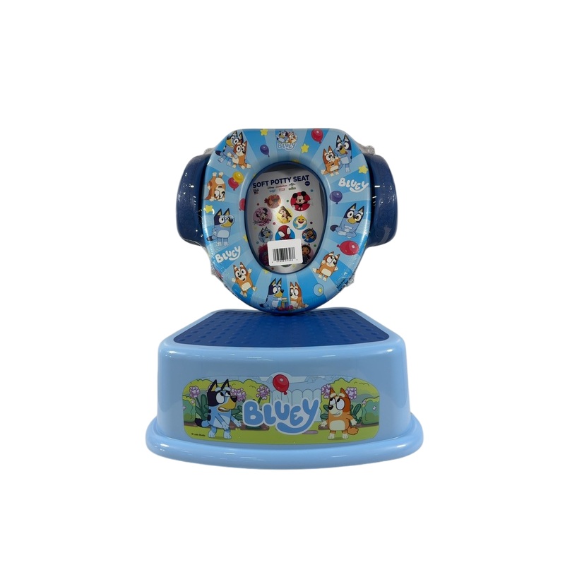 Conquer potty training with the Soft Potty Seat and Step Stool. Designed to fit both regular and elongated toilets, the seat is lightweight and skid-resistant for added safety. Featuring fun character designs, Bluey and Bingo, this set is easy to clean with mild soap and water.