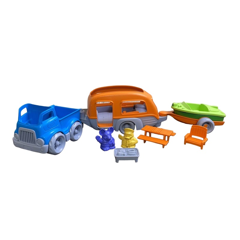 “Head off on adventures with this camper set that includes a pick up truck, camper, boat with trailer and other camping accessories.”