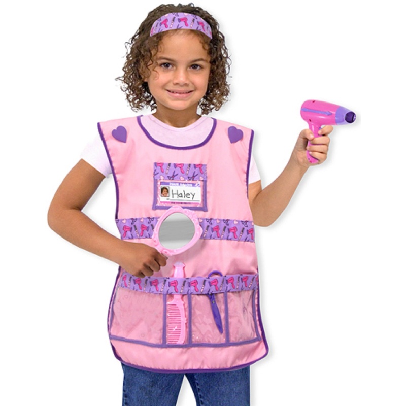 With our hair stylist costume young hairdressers will have lots of pretend play fun! The set includes a machine-washable smock, a personalisable name, a comb, brush, a battery-powered hairdryer that sounds like the real thing, non-cutting scissors, a headband and a hand mirror!