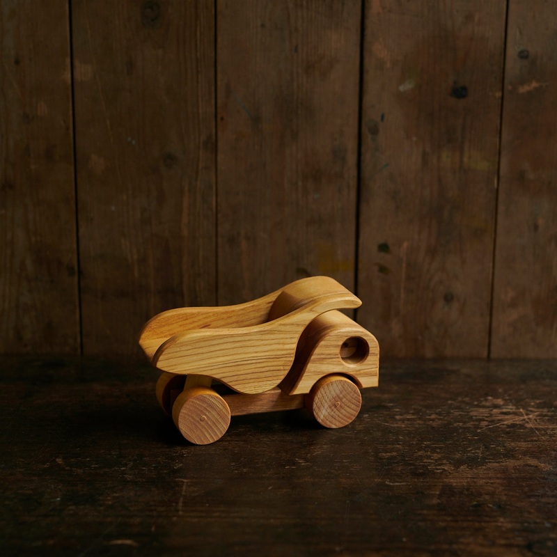 The Dumper Truck is a four-wheeled hardwood toy. It is sanded and oiled to a high finish. The loading bucked tips to the back. The Dumper truck can easily be loaded onto the Low Loader.