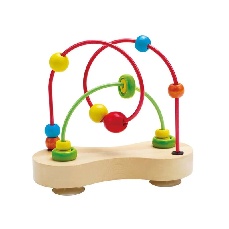 Get lost in fun with the Double Bubble Wire Maze by Hape!Foursuction cups hold this wire maze to the table as your toddler works the wooden beads from one end to the other, slipping larger beads over the smaller ones. There’s always a new way to scoot around this endless maze. Four sturdy suction cups secure the solid wooden base to virtually any smooth surface. Nesting beads demonstrate the concept of “inside/outside” and offer peek-a-boo fun.