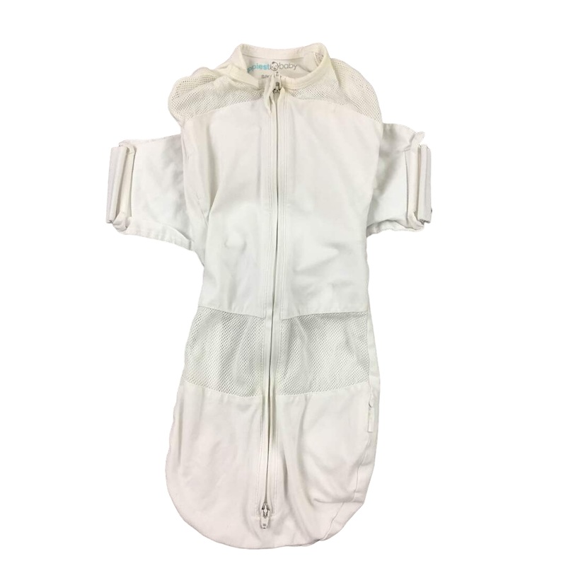 “This soft organic swaddle is specifically designed to work with the SNOO bassinet. The wings attach to the beds clips to keep baby snug and safe on their back all night long. Size Small (5-12 lbs).”