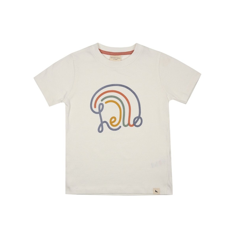 Made from 100% GOTS certified organic cotton, this t-shirt is a contemporary choice for girls and boys with an uplifting hello slogan to brighten up their day! This ecru base top is great for layering with dungarees, leggings, skirts, shorts, bloomers and more – perfect for seasonless dressing and endless adventures.