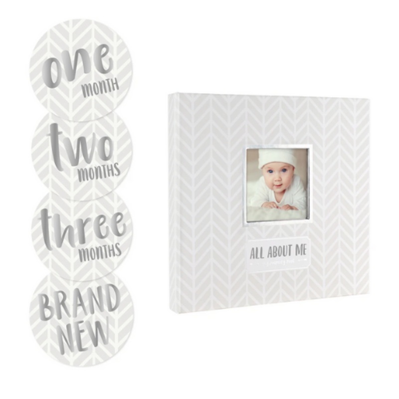 Pearheads babys memory book and sticker set. This cute babybook is the perfect way to cherish every one of babys moments. It includes 50-acid free pages with descriptions to fill in all about baby! When baby says momma for the first time or starts to walk, capture those most precious memories in the book. For years to come, every time you open this book every memory will bring you back to the day they happened! Each page includes descriptions so you have an easy-to-follow guide for filling everything in. This book also includes 16 belly stickers, one for each month of babys first year plus a few bonus stickers with adorable little animal designs. Simply place the sticker on babys belly and snap a picture! Share with everyone you love on social media and then print the picture to include in the book. The books entire theme is too cute with silver and gray herringbone designs, making it the perfect baby shower gift for baby boy or baby girl. The modern designs are fun for baby to look at and great for decorating babys nursery. You can even display a 3.25 x 3.25 photo on the front cover. Also store some of babys most adorable keepsakes in the back of this book with the included pocket folder. After babys first year, continue to fill the book in with memories from babys birthday every year. The entire book is spiral bound ensuring the pages wont come loose when baby starts to play with their little book. When posting the belly sticker pictures use our hashtag #mylittlepearhead for a chance to be featured on Pearheads pages. Never forget a moment and always cherish babys most adorable moments with Pearheads babys memory book and sticker set. Product dimensions: Book 10.13 W x 9.50 H x 1.06 D; Stickers 4 W x 4 H; Cover photo insert: 3.25 x 3.25
