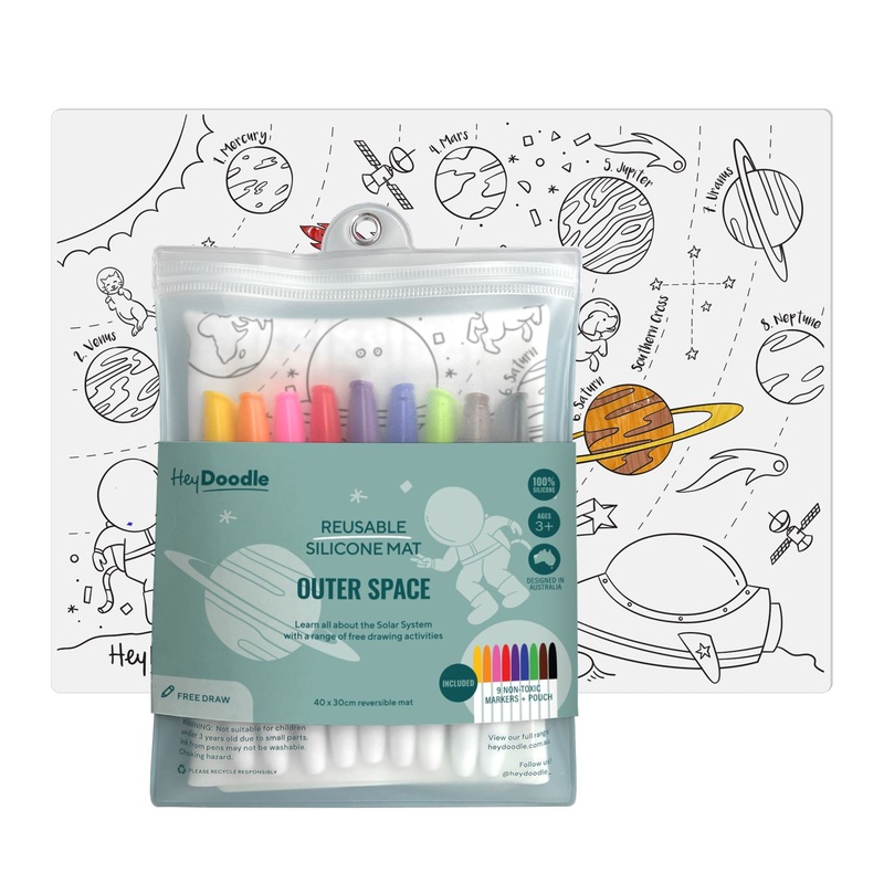 Each mat is thoughtfully designed and features an educational theme (ie space, letters, farm animals, numbers) so your curious kids can learn as they trace, draw and colour!