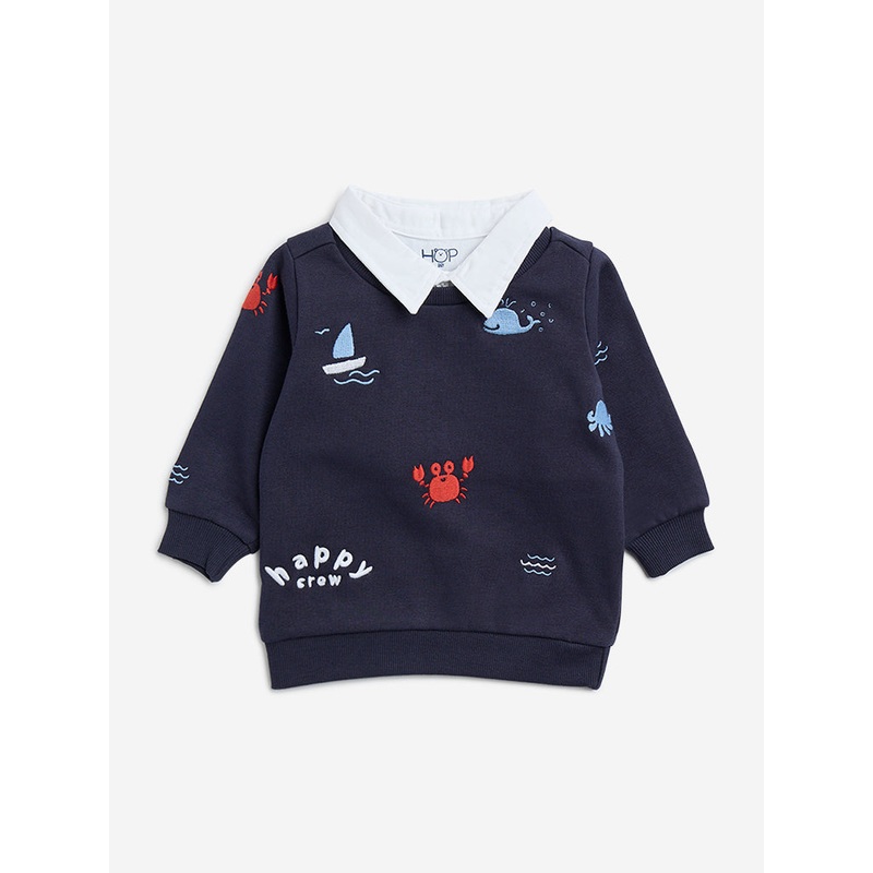 HOP Baby launches this navy sweatshirt in sea-theme embroidery. The breathable fabric garment features a spread collar and full sleeves for a smart look. It boasts a ribbed waistband for quality fit.