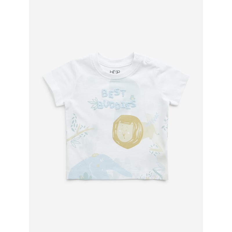 This white t-shirt from HOP Baby combines animal prints with text designs. Made from cotton fabric, it includes a crewneck and short sleeves, with snap buttons for effortless wearability.